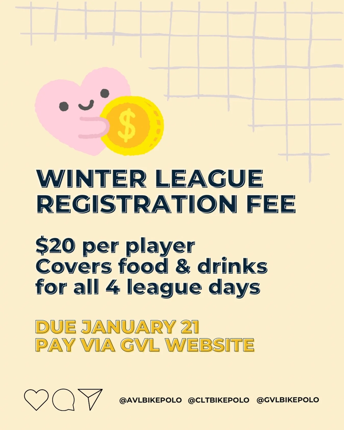 Carolina Winter League reminder: The $20 fee helps cover food + drinks + balls + supplies.