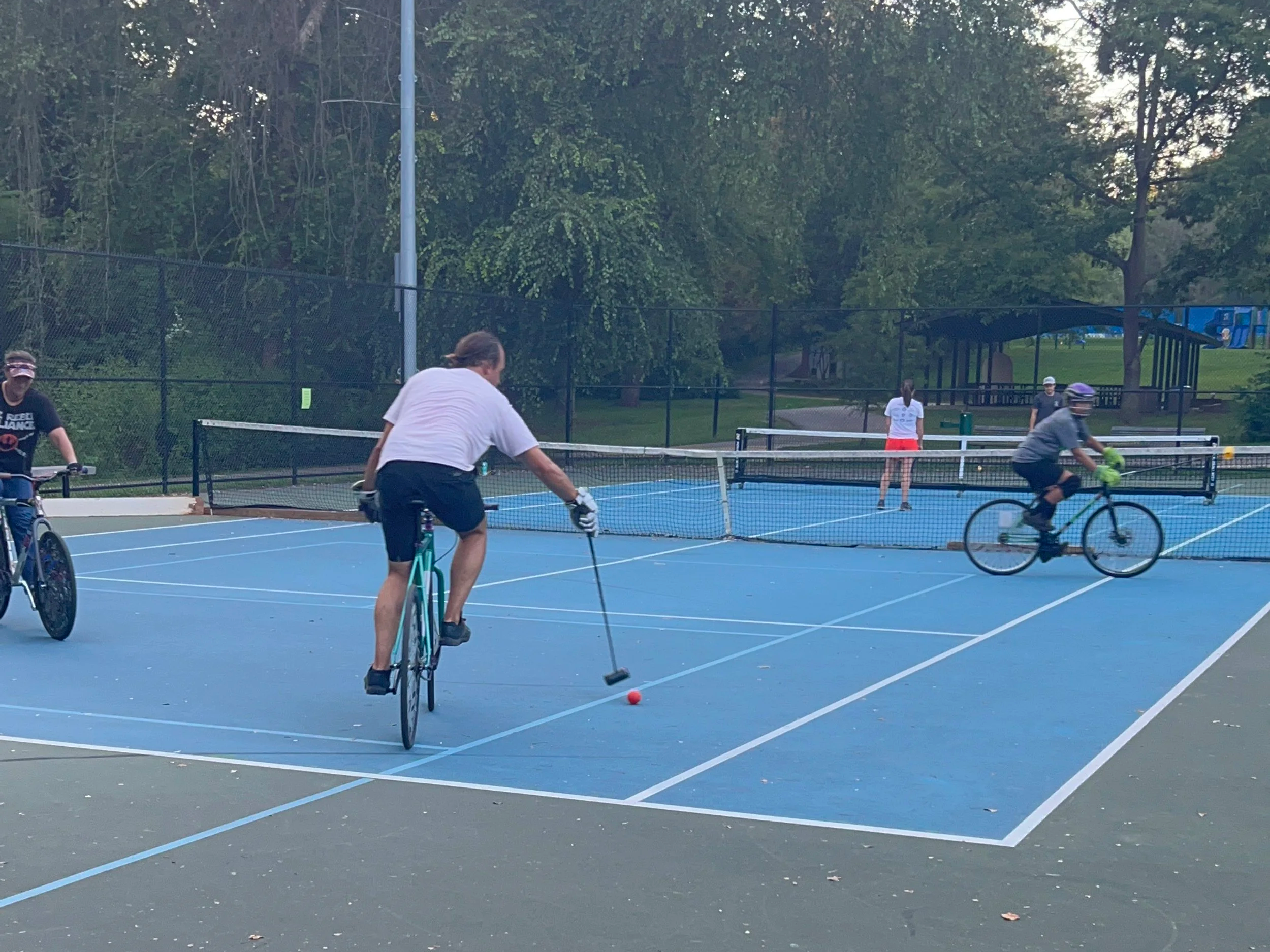 In September, we followed up with the county to ask for permission to play at the park and to advocate for basic bathroom repairs. Rather than approving our request, the county installed new signage banning bikes from the tennis courts. Damage to a nearby basketball court, which we had never used, was documented and attributed to our group.